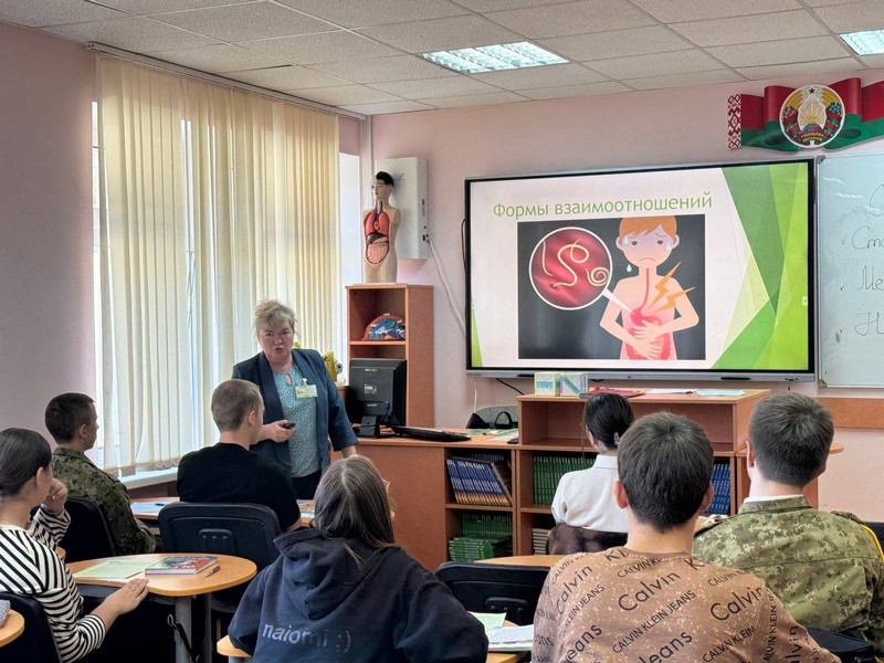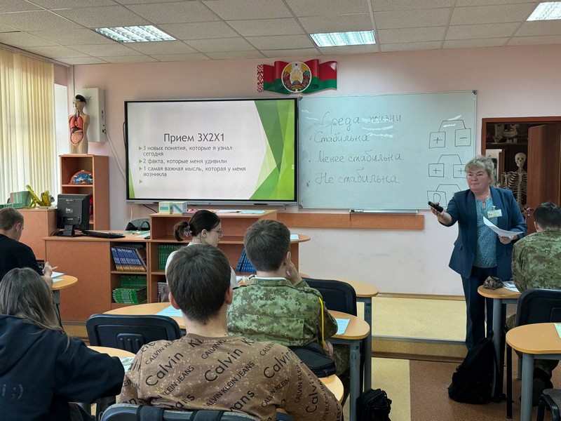 Светлана Леоновна Воронович, учитель биологии ГУО «Мядельская средняя школа № 2» , с 10 «А» классом разговаривала на тему «Живой организм как среда обитания». На протяжении урока учащиеся работали с маршрутными рабочими листах и изучали теоретический материал по группам.