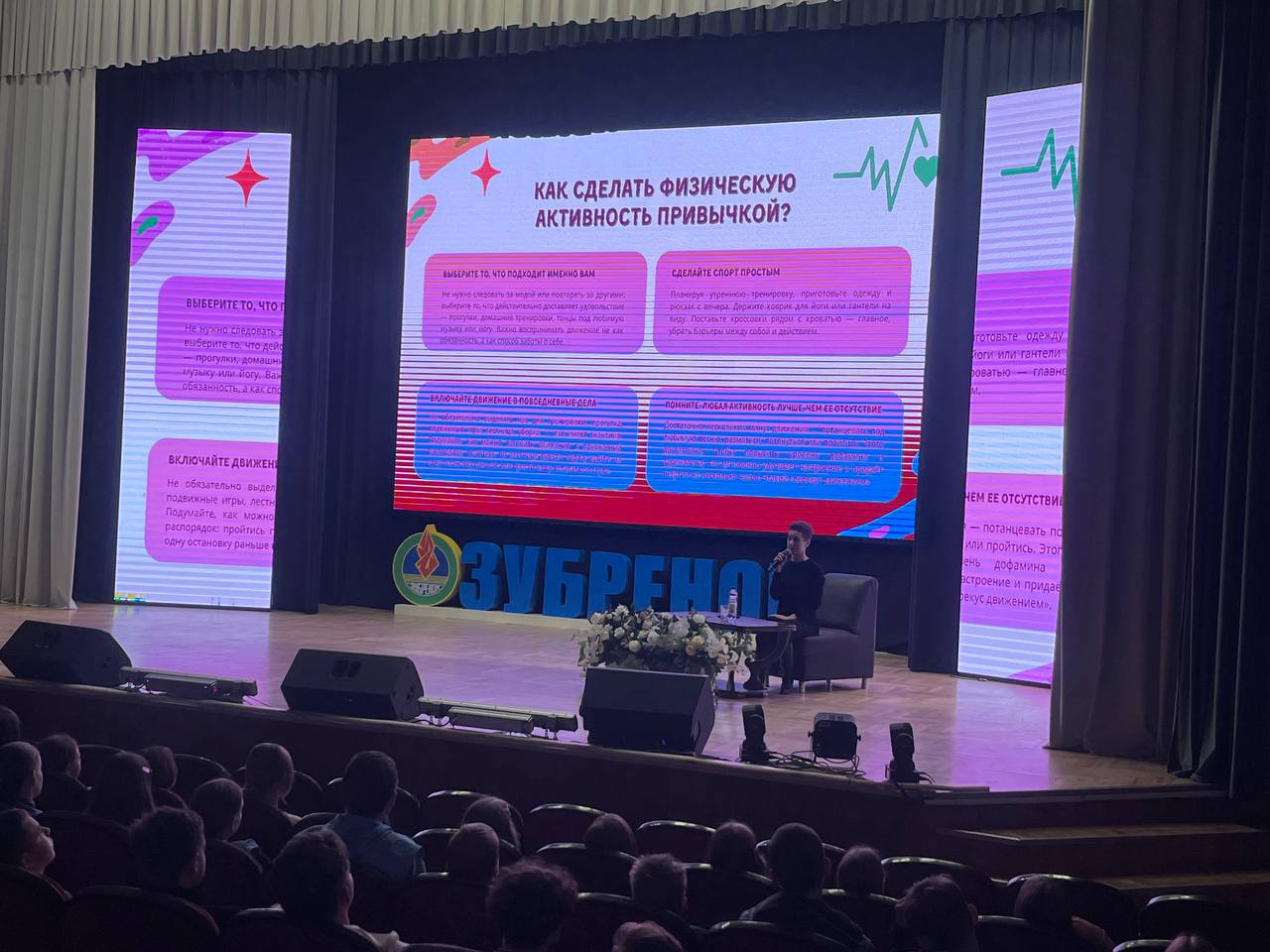 В ходе диалоговой площадки участники обсудили широкий круг вопросов: от правильного питания и физической активности до профилактики вредных привычек, и управления стрессом. Особое внимание было уделено развенчанию популярных мифов о ЗОЖ, которые часто встречаются в интернете и вводят в заблуждение молодежь. Екатерина Ивановна поделилась с ребятами комплексом упражнений, которые способны снять физическую усталость, а также ответила на все актуальные вопросы зубрят.