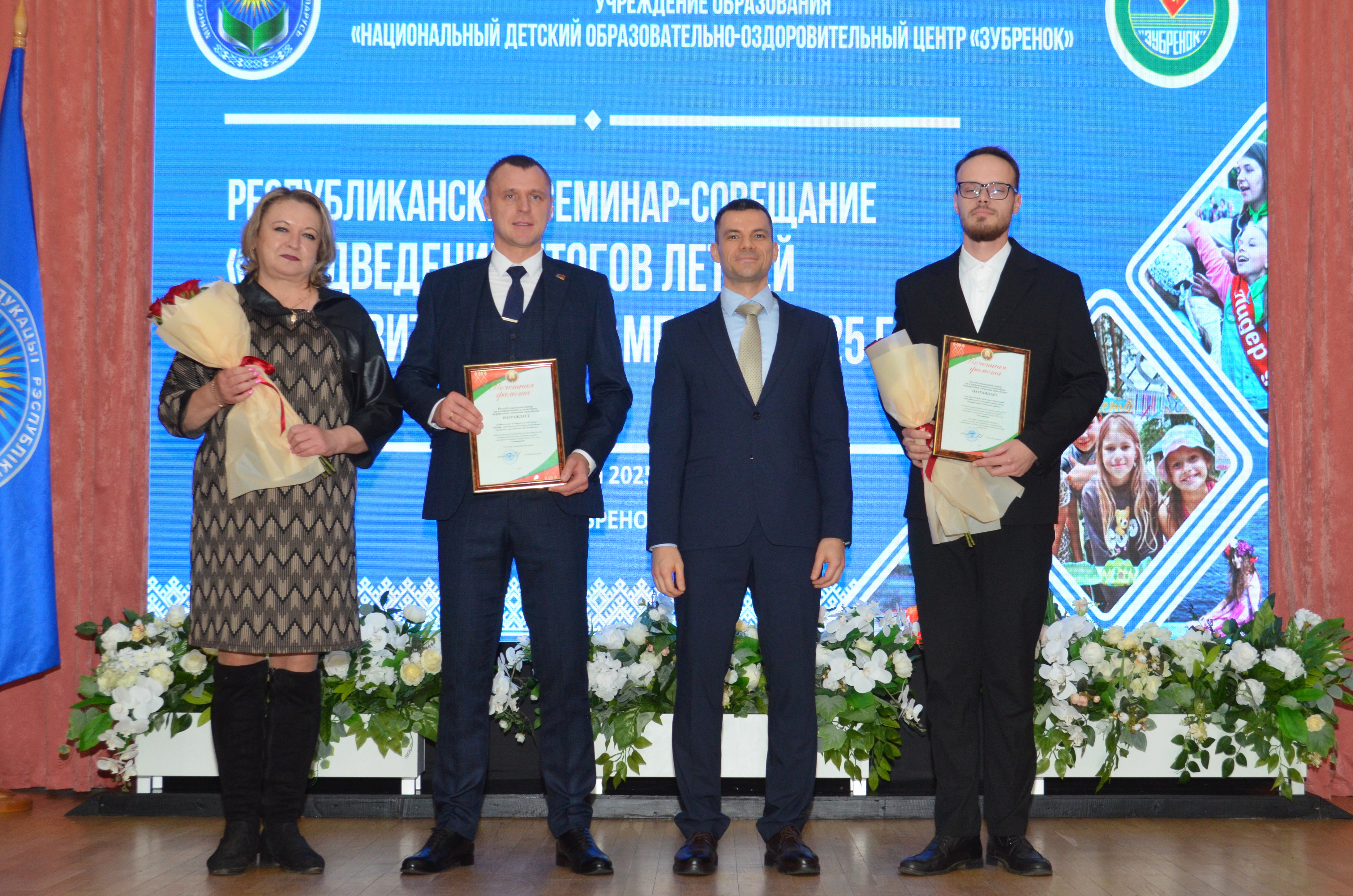 Дипломом Министерства образования Республики Беларусь I степени награждаются Коргина Алина Никодимовна, Ивуть Елена Анатольевна, Змитрович Анастасия Ивановна и Морочковская Анна Юрьевна, авторы проекта «Патриотск – город, который мы построим!» воспитательно-оздоровительного учреждения образования «Оздоровительный лагерь «Берёзка» Лидского района».