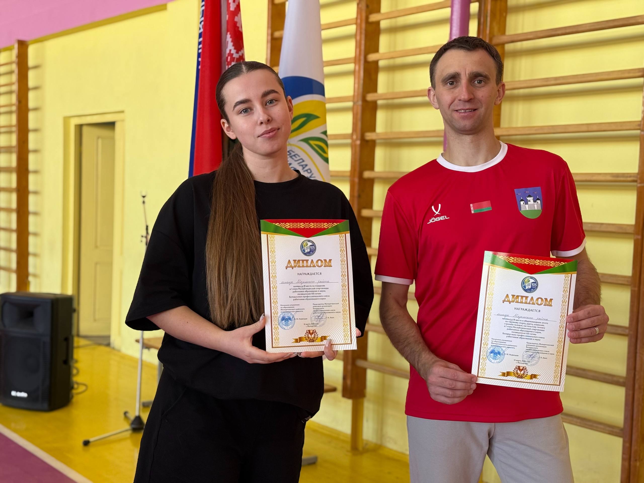 Алина Лазакович, воспитатель, и Виталий Филипович, заведующий отделом физкультурно-оздоровительной работы, приняли участие в соревнованиях в составе команды Мядельского района. Алина принесла в зачет команды 3-е место по плаванию, Виталий – 3-е место в соревнованиях по настольному теннису.