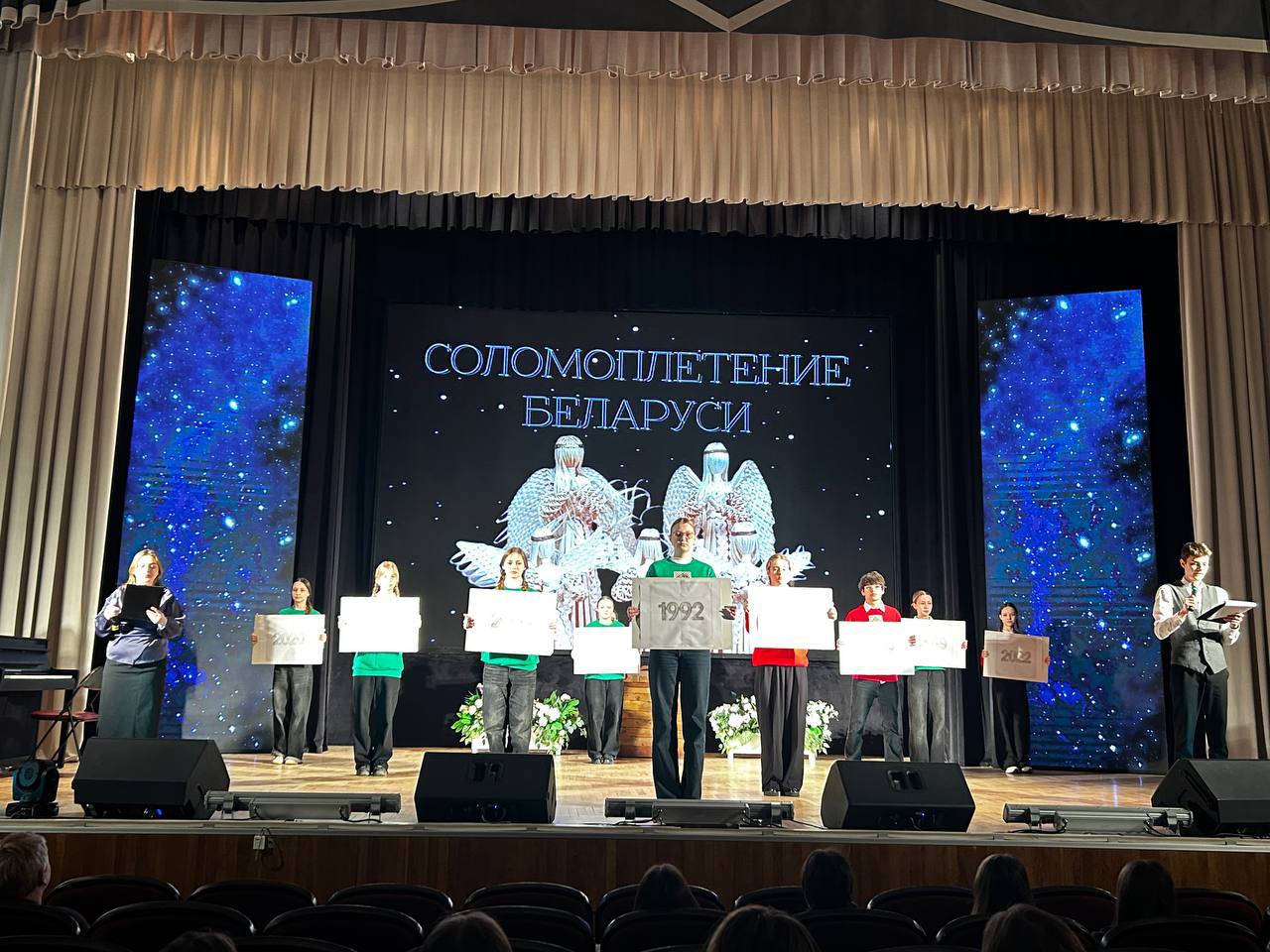 Учащиеся вместе с ведущими совершили виртуальное путешествие по самым знаковым объектам страны, включённым в список Всемирного наследия ЮНЕСКО: от древней Беловежской пущи и величественных замков в Мире и Несвиже до уникальных колядных обрядов, соломоплетения, вытинанки и недавно включённой Неглюбской текстильной традиции.